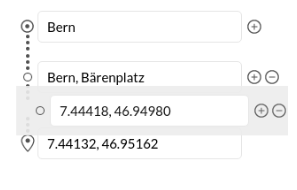Bearbeiten: Wegpunkte können aktualisiert werden, indem sie mithilfe der zuvor beschriebenen Eingabefelder neu definiert werden. Geben Sie entweder neuen Text ein und wählen Sie eine Haltestelle aus den Vorschlägen aus, oder passen sie die Koordinaten an, indem Sie zuerst auf das Eingabefeld klicken und dann auf die Karte.