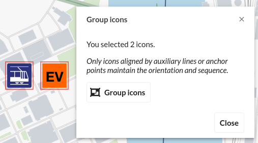 Sobald mehrere Icons ausgewählt sind, wird ein Popup zum Gruppieren von Piktogrammen geöffnet, in dem der Benutzer verschiedene Icons in einer Gruppe zusammenfassen kann. Die Gruppierung kann anschliessend wieder gelöscht werden, indem Sie ein gruppiertes Icon auswählen und im Popup auf die Schaltfläche Gruppierung aufheben klicken.