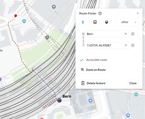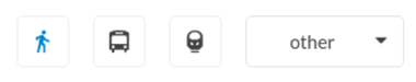 Wenn das Route-Finder-Popup geöffnet wird, wählen Sie zuerst ein Verkehrsmittel aus. Die Haupt-Verkehrsmittel (Fuss, Zug, Bus) verfügen über spezielle Tasten, während mehrere andere Verkehrsmittel aus einem Dropdown-Menü ausgewählt werden können. Durch das Umschalten zwischen Verkehrsmitteln wird jeweils die aktuelle Route gelöscht und eine neue gestartet.