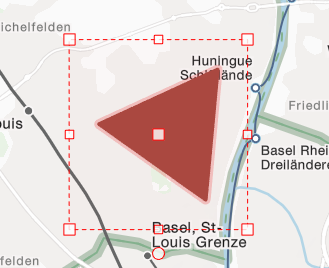 Durch Klick in die Karte und Mausbewegung (ohne Klick) wird die Form erstellt. Die Form kann dabei beliebig gross gezogen und gedreht werden. Ein weiterer Klick in die Karte platziert die Form am gewählten Ort.