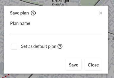 Klicken Sie auf diesen Text, um einen neuen Plannamen einzugeben. Ein Spinner und Bestätigungsmeldung neben dem Texteingabefeld zeigt an, dass der Name gespeichert wurde. Alternativ kann über das Speichern-Tool aus der Seitenleiste ein Dialog-Fenster geöffnet werden, wo in einem Texteingabefeld ebenfalls der Planname gesetzt bzw. aktualisiert werden kann.
