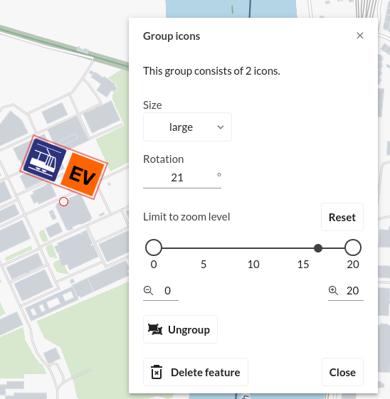 Icons können mithilfe des Popups gestaltet werden, wenn ein Icon ausgewählt wird. Unterteilt in mehrere Kategorien stehen eine Vielzahl von Icons zur Verfügung, die auf die Karte gezeichnet werden können. Die Drehung und die Grösse des Icons kann individuell eingestellt werden.